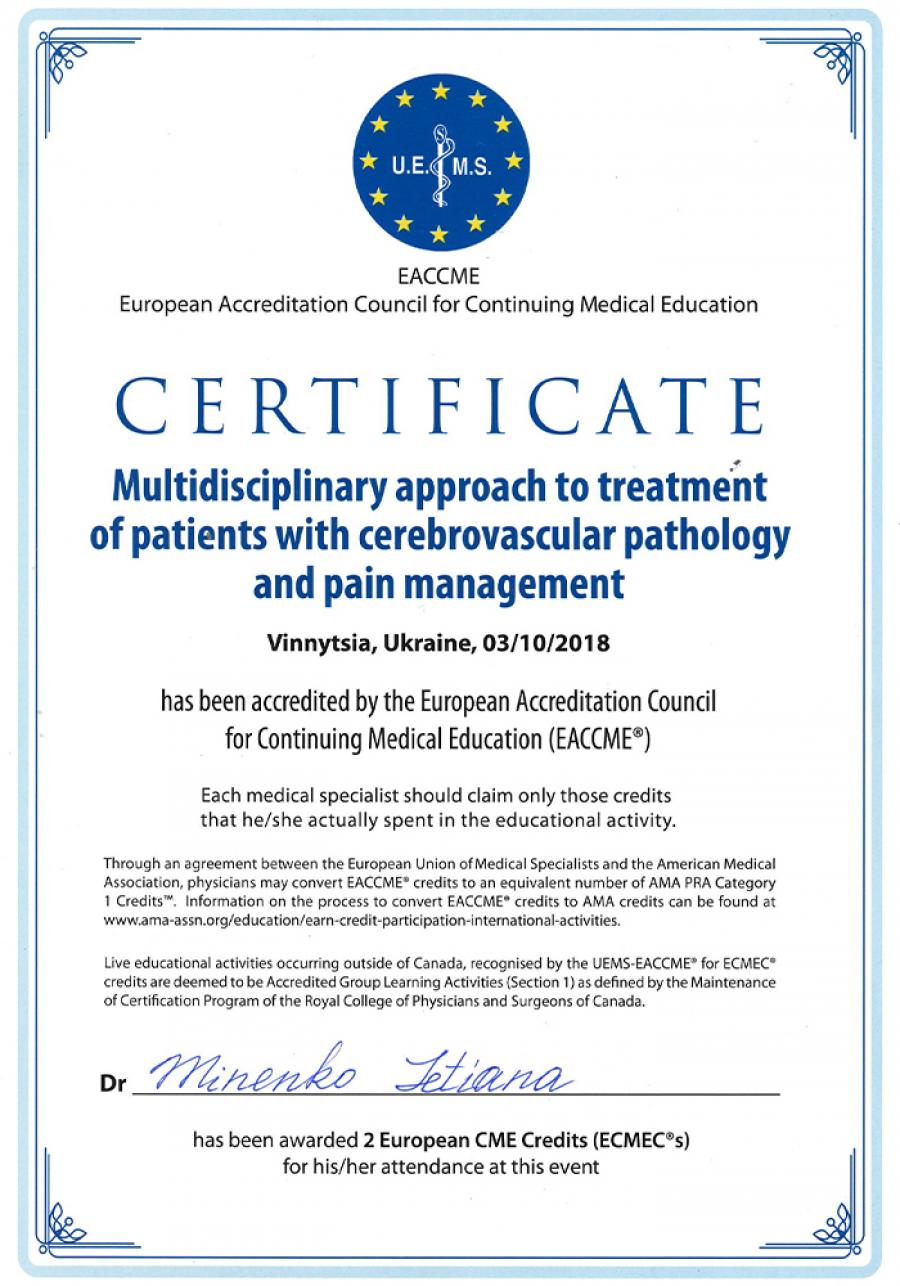 - 2019 – Інститут післядипломної освіти Національного медичного університету ім. О. О. Богомольця, спеціальність "Неврологія";